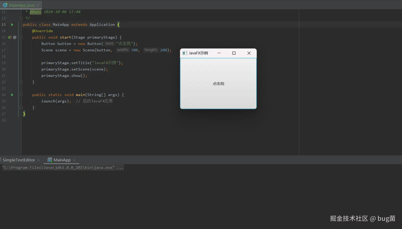 如上段代码创建了一个基本的 JavaFX 应用程序,显示一个带有 "点击我" 按钮的窗口。运行逻辑如下: