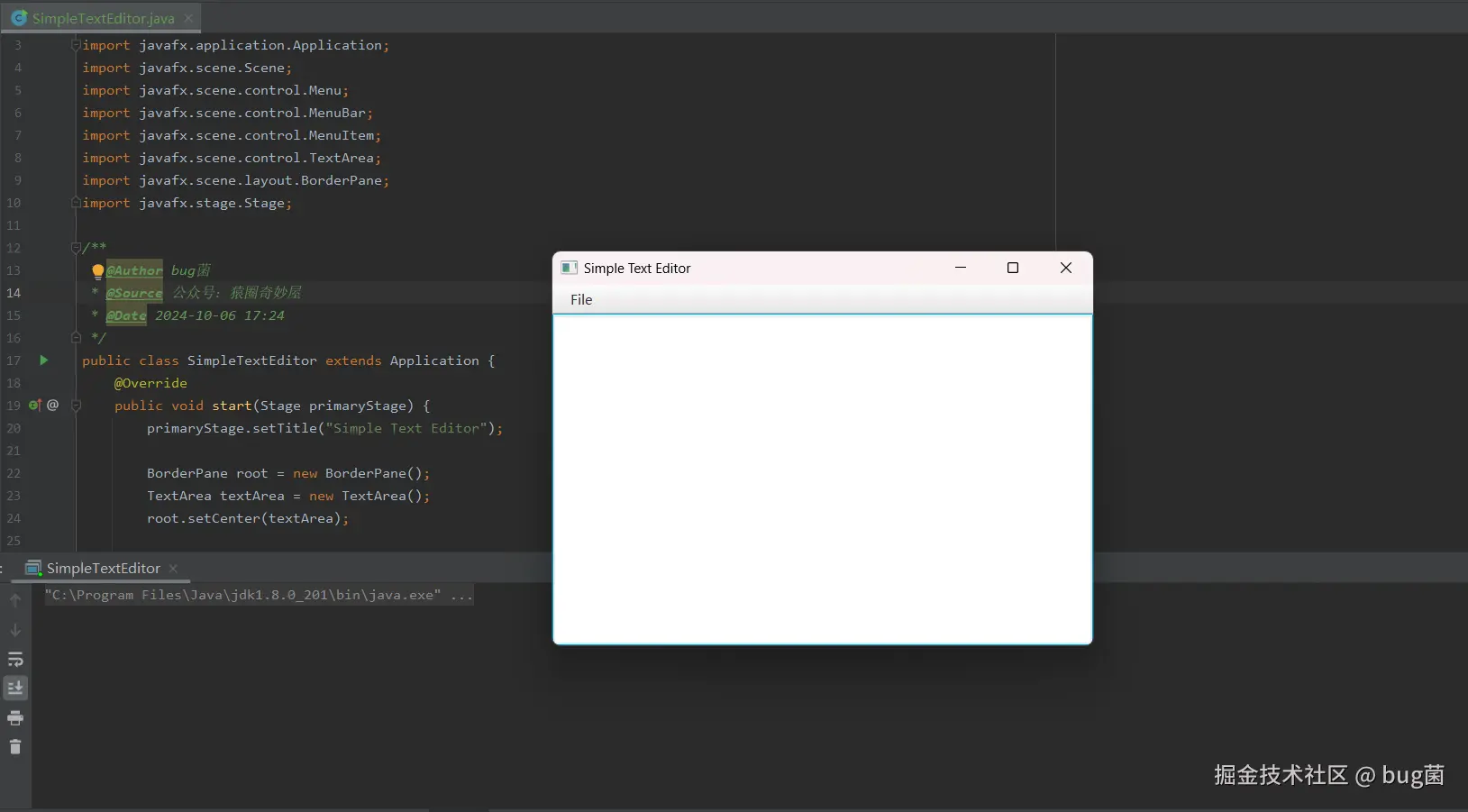 下面我们通过一个案例展示如何使用JavaFX创建一个带有菜单和文本区域的简单文本编辑器界面。