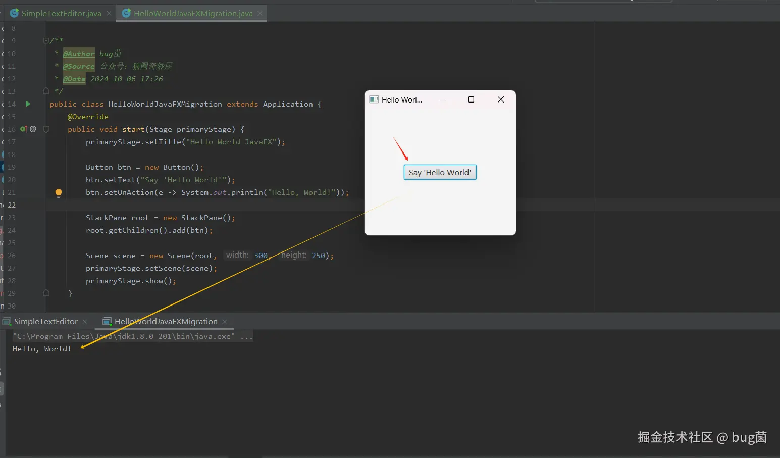 这段代码创建了一个简单的 JavaFX 应用程序,展示一个带有按钮的窗口。点击按钮时,会在控制台打印 "Hello, World!"。主要流程包括: