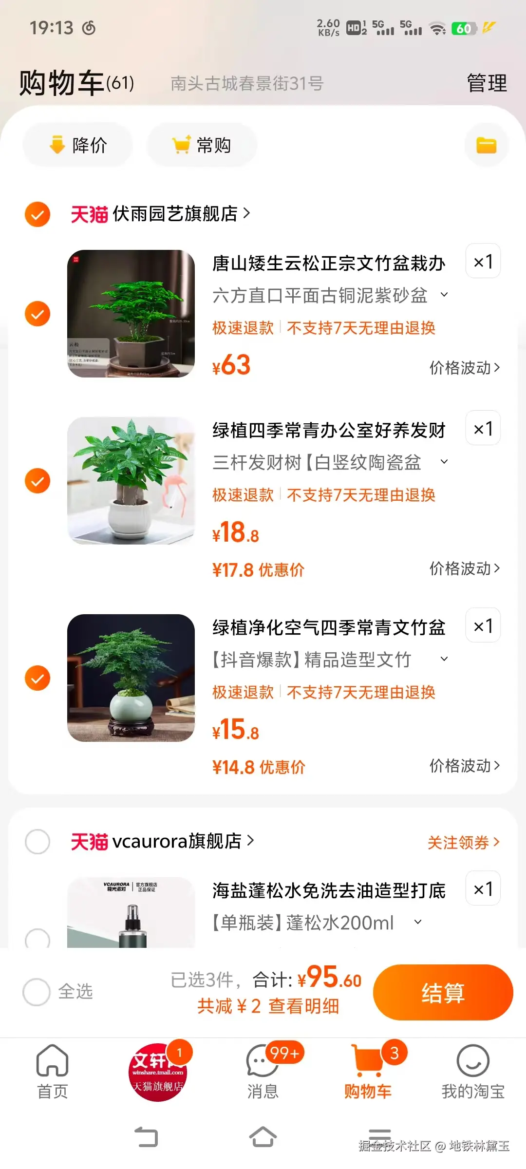 上文所述乃现实生活中的购物车,以最为经典的购物 App 淘宝为例,如下是两张淘宝 App 购物车的截图,可算是对现实世界里的购物车进行了一定程度的虚拟化呈现。