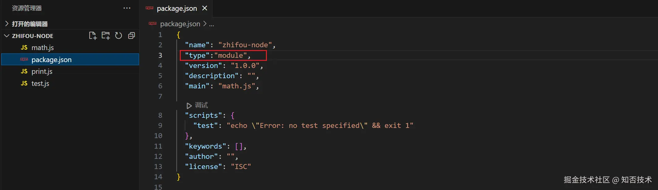 这时会立即生成 package.json 文件,然后配置 "type":"module" ,这样我们就可以在 node 环境下体验 ES6 模块化了。