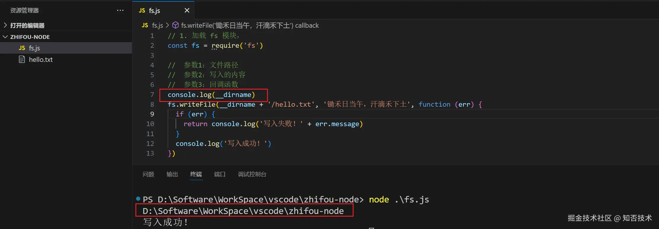 fs.writeFile(__dirname + '/hello.txt', '锄禾日当午,汗滴禾下土', function (err) {