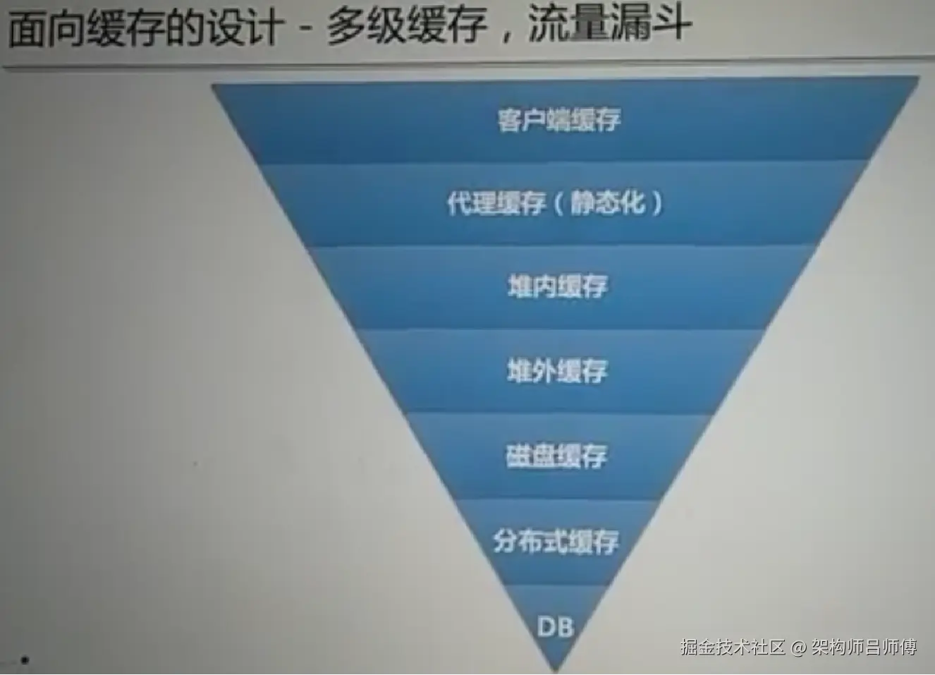 这张图片展示了面向缓存的设计理念——多级缓存、流量漏斗。具体来说,它描绘了一个倒置的金字塔结构,从上到下依次为: