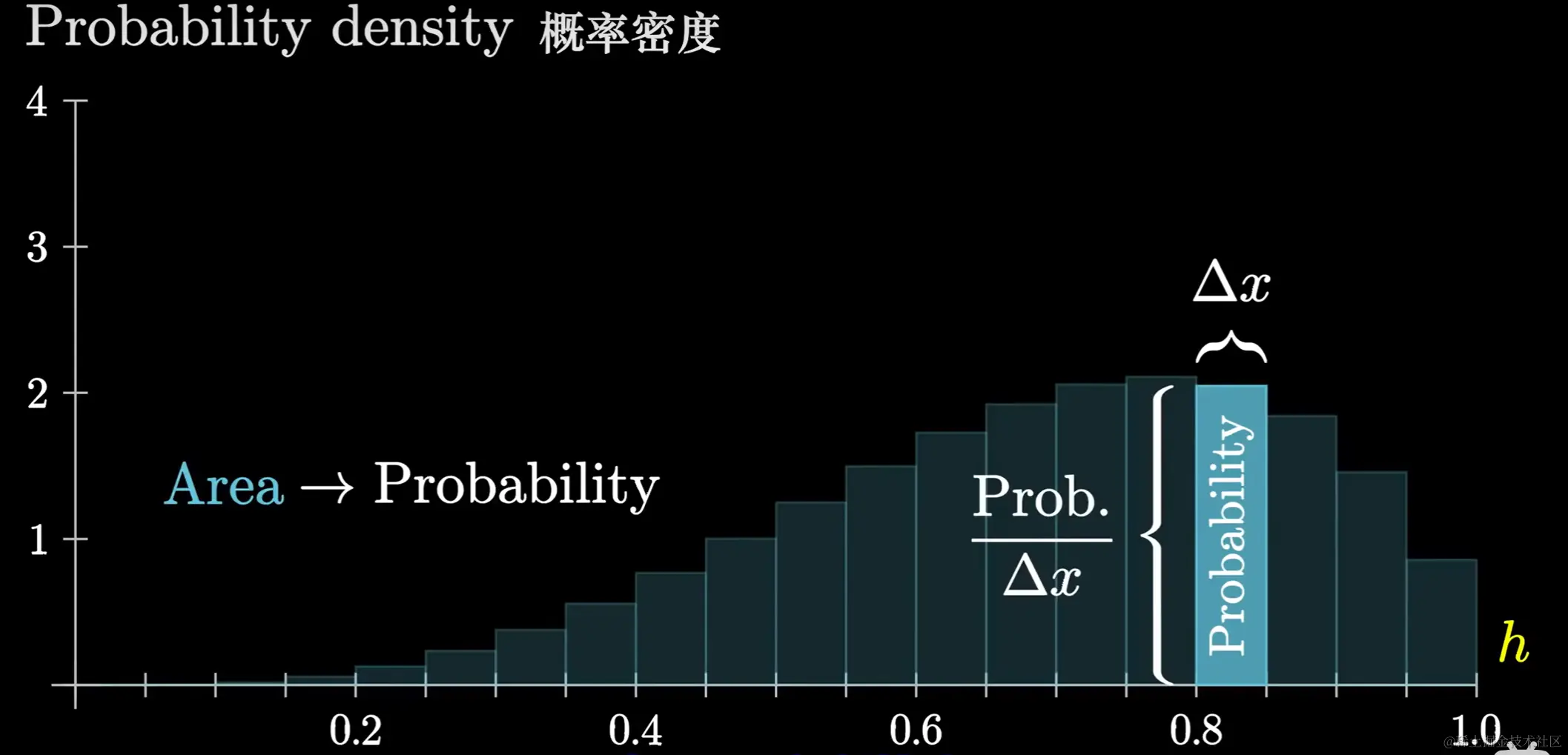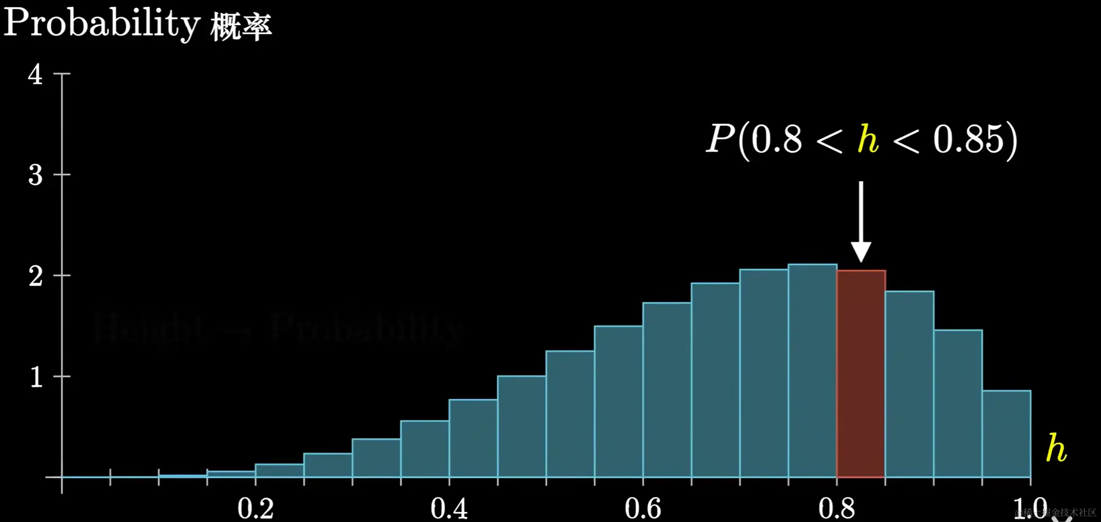 举个例子,我们可以用这些柱子表示h落在0.8-0.85之间的概率,但是注意,我们不要用柱子的高度表示概率,而是应该用柱子的面积表示(原因下面会解释) 。