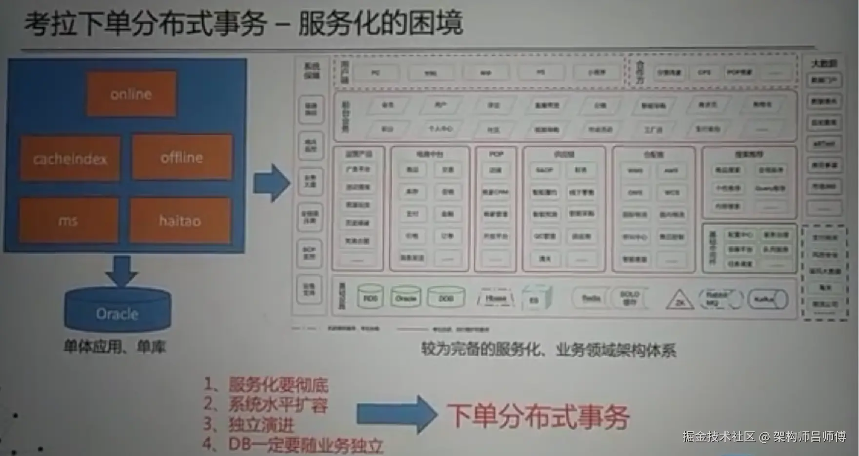要彻底服务化、系统要具备水平扩容、独立演进,DB也一定要随业务独立。那边就逃不开数据一致性问题,而通常需要分布式事务来解决。