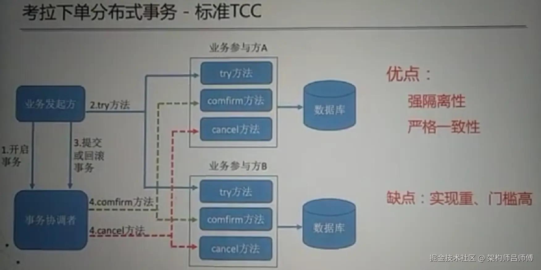 - cancel方法:用于回滚操作失败的方法。如果在任何一步操作中出现错误或异常情况,则调用此方法来取消之前进行的所有操作。