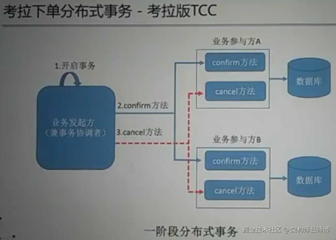 因此我们参考标准TCC,结合考拉当时的实际情况,设计了考拉版本的TCC,我们称之为一阶段分布式事务。