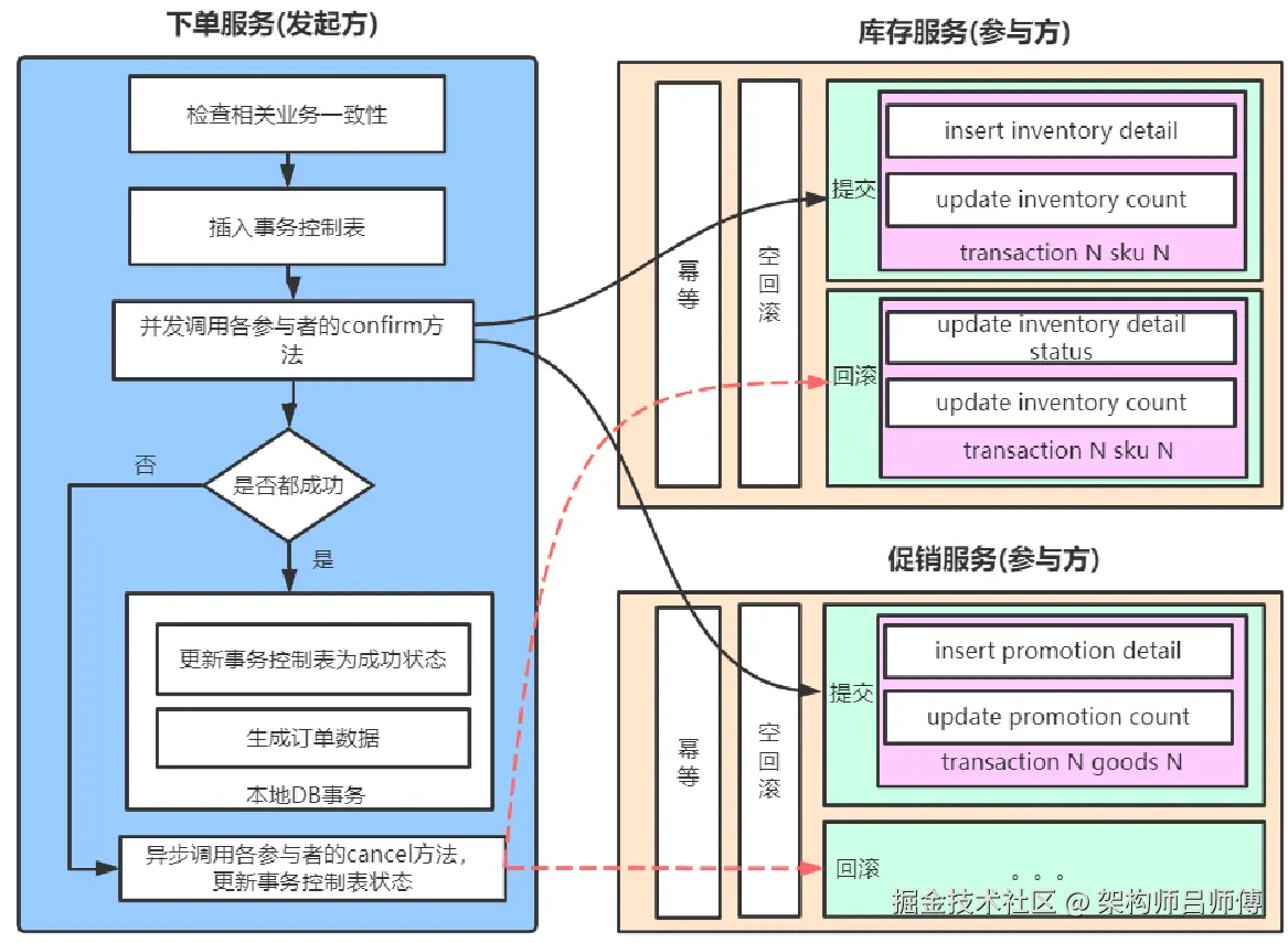 - 幂等性:Confirm和Cancel操作需要设计成幂等的,以避免重复执行导致的数据不一致。