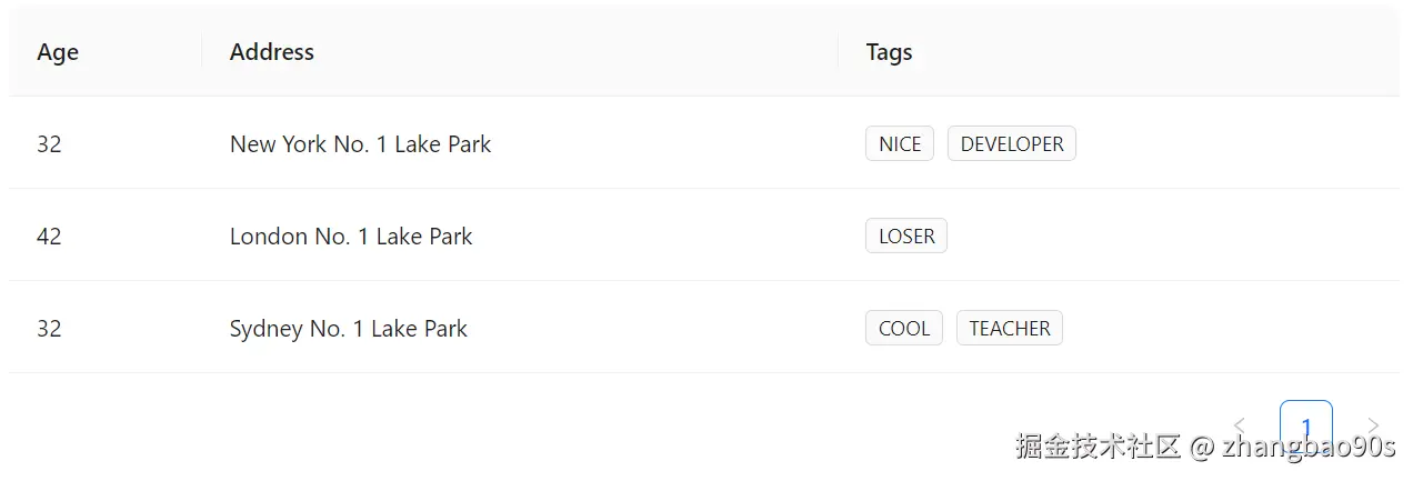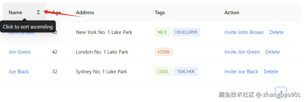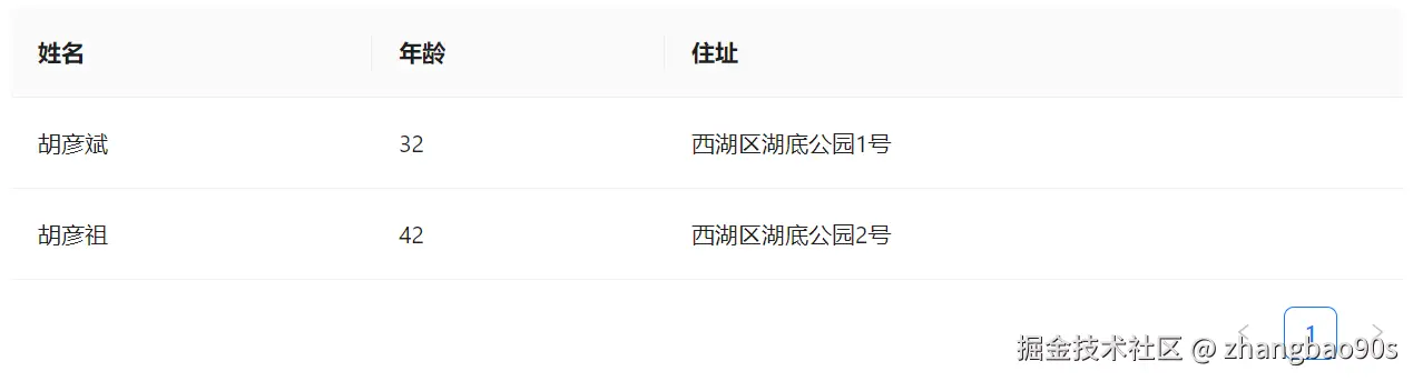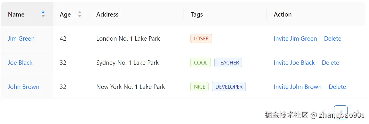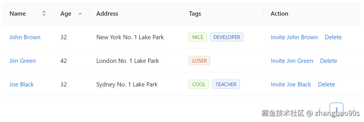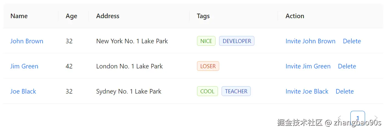 同时,你还能看到右下角还有一个分页标记。没错,<Table> 组件还自带了分页展示支持(通过 Pagination 组件)!这一块内容后续我们会细讲,先忽略。