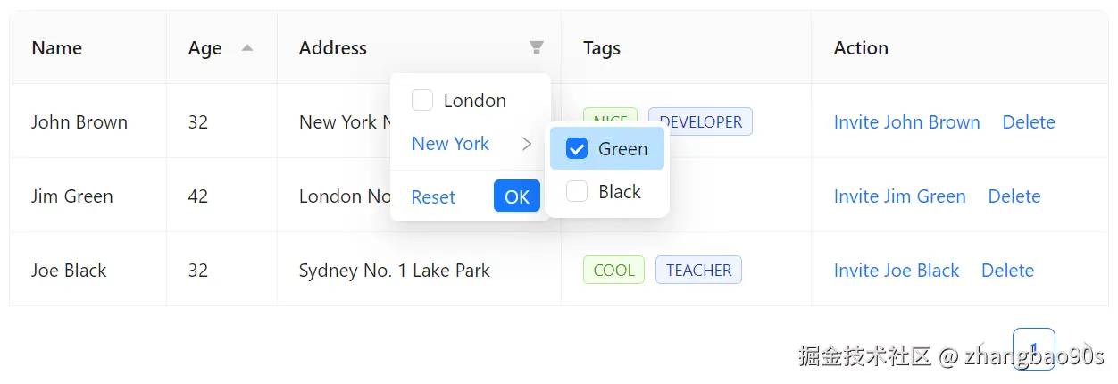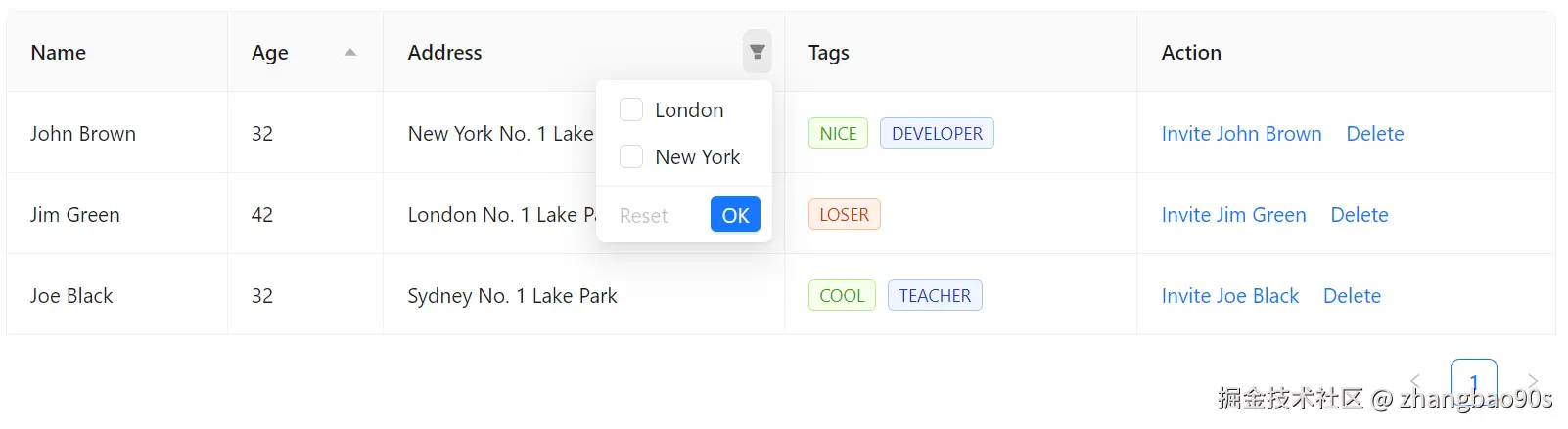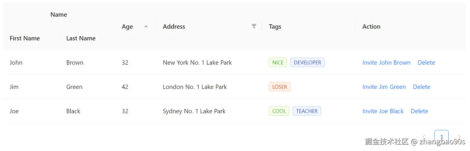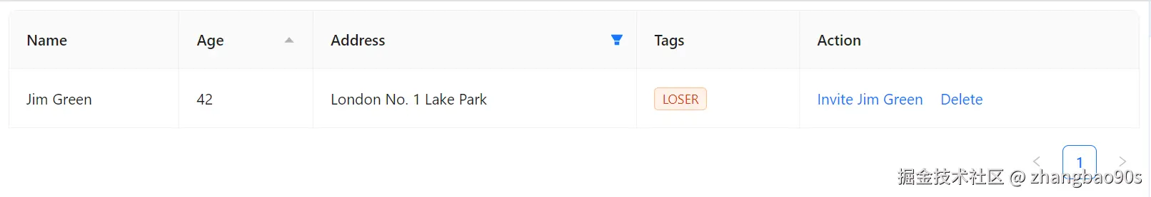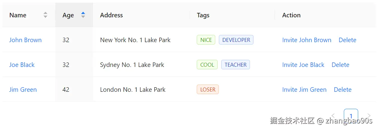 同时,你还能看到右下角还有一个分页标记。没错,<Table> 组件还自带了分页展示支持(通过 Pagination 组件)!这一块内容后续我们会细讲,先忽略。