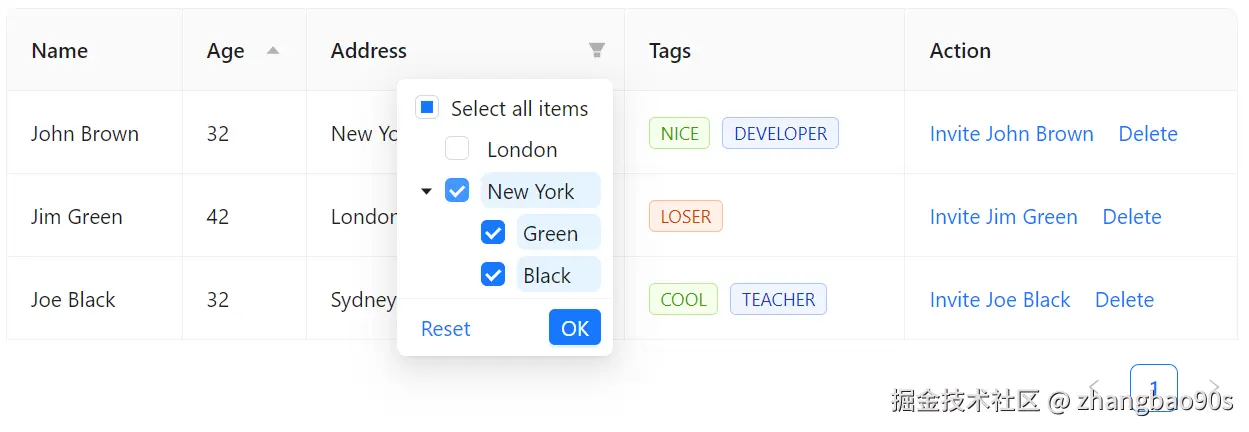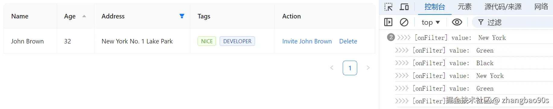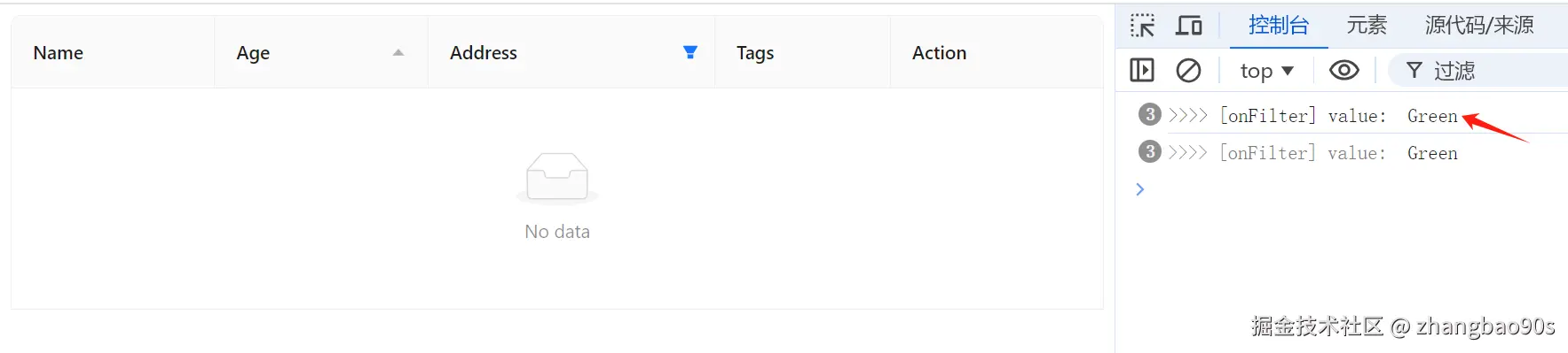 再来说说字段过滤。要先实现过滤效果,需要在 column 上的两个 prop 搭配使用:filters 和 onFilter。
