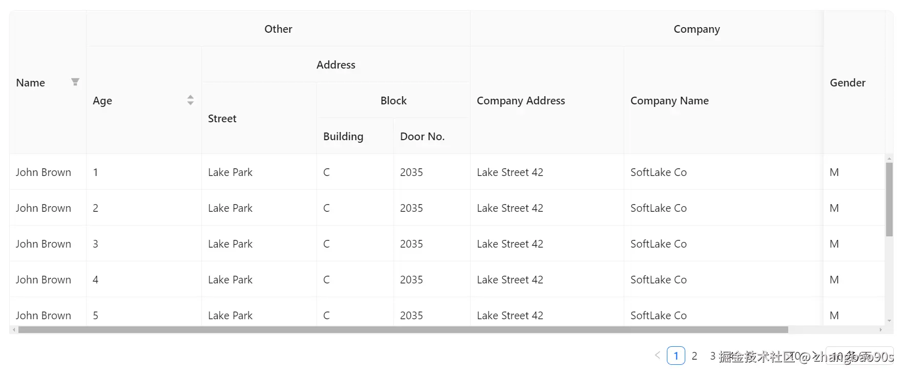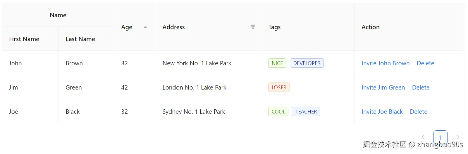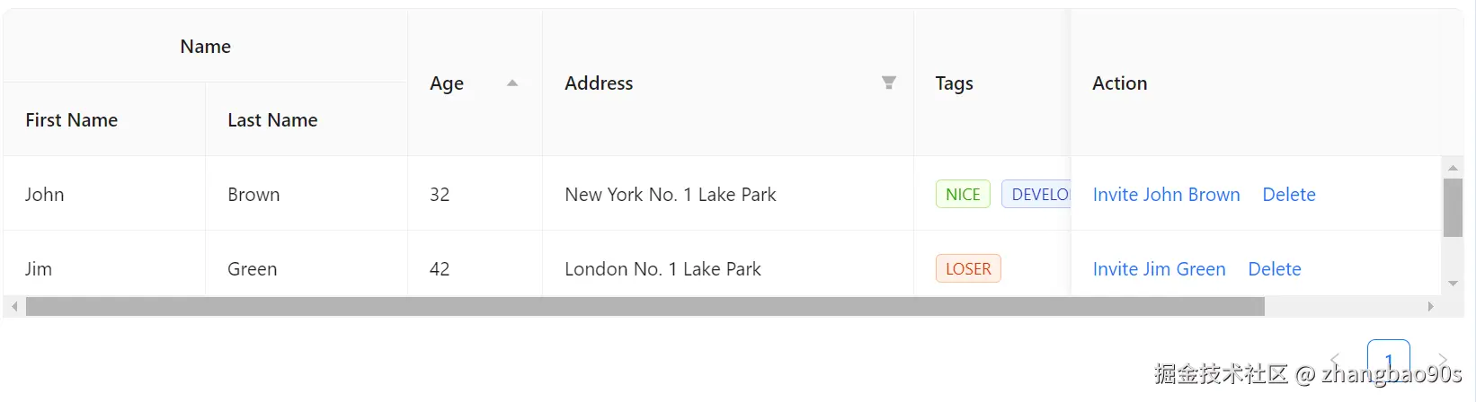 为了能够实现上述的分组表头展示,我们需要调整下数据源——将 name 字段拆分成 firstName 和 lastName。
