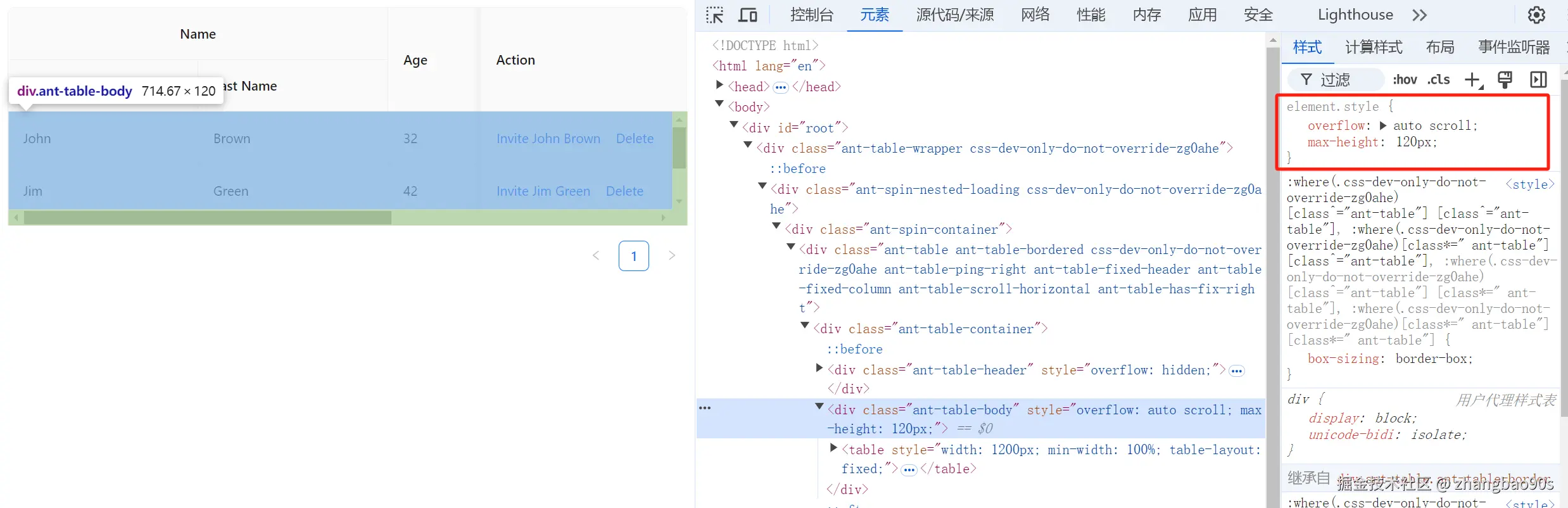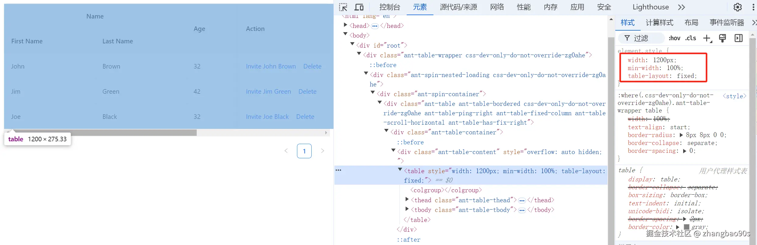 其次,你能看到 scroll={{ x: 1200 }} 的设置最终作用到了 <table> 元素上。