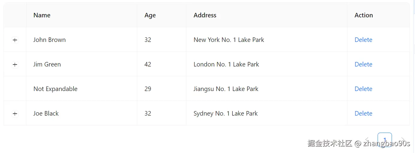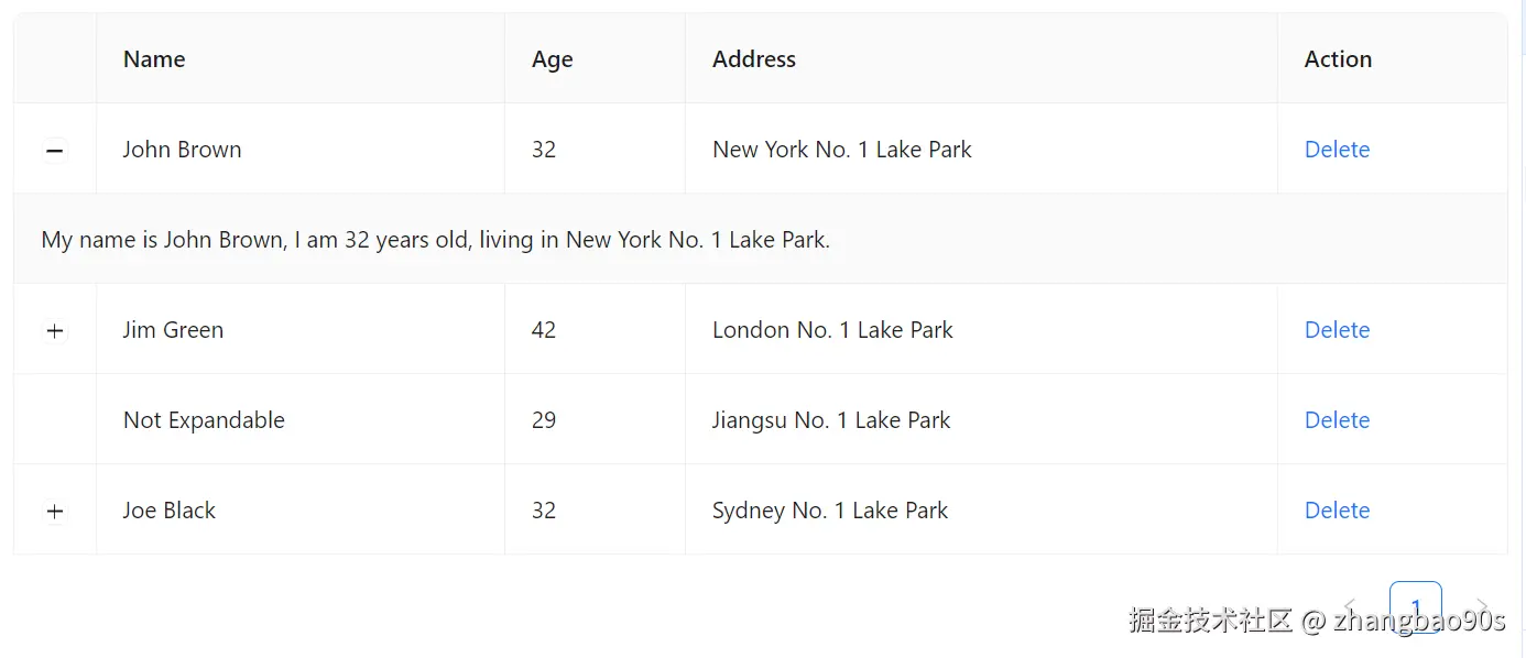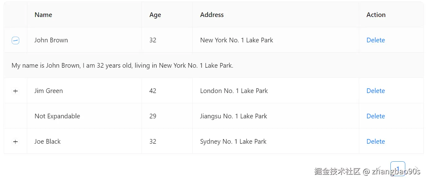 <Table> 中通过 expandable prop 来设置展开行为。其主要有 2 个分关键子属性:expandedRowRender 和 rowExpandable。
