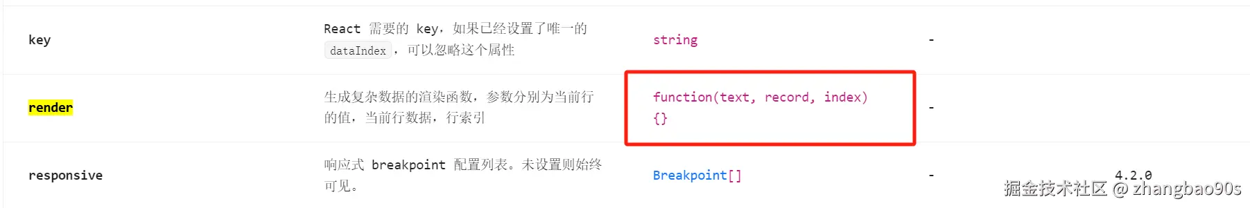 不过,<Table> 在内部渲染时,帮我们做了一个优化——如果我们已经设置了 dataIndex,那么 key 默认就等于该值,是可以忽略不去设置的。
