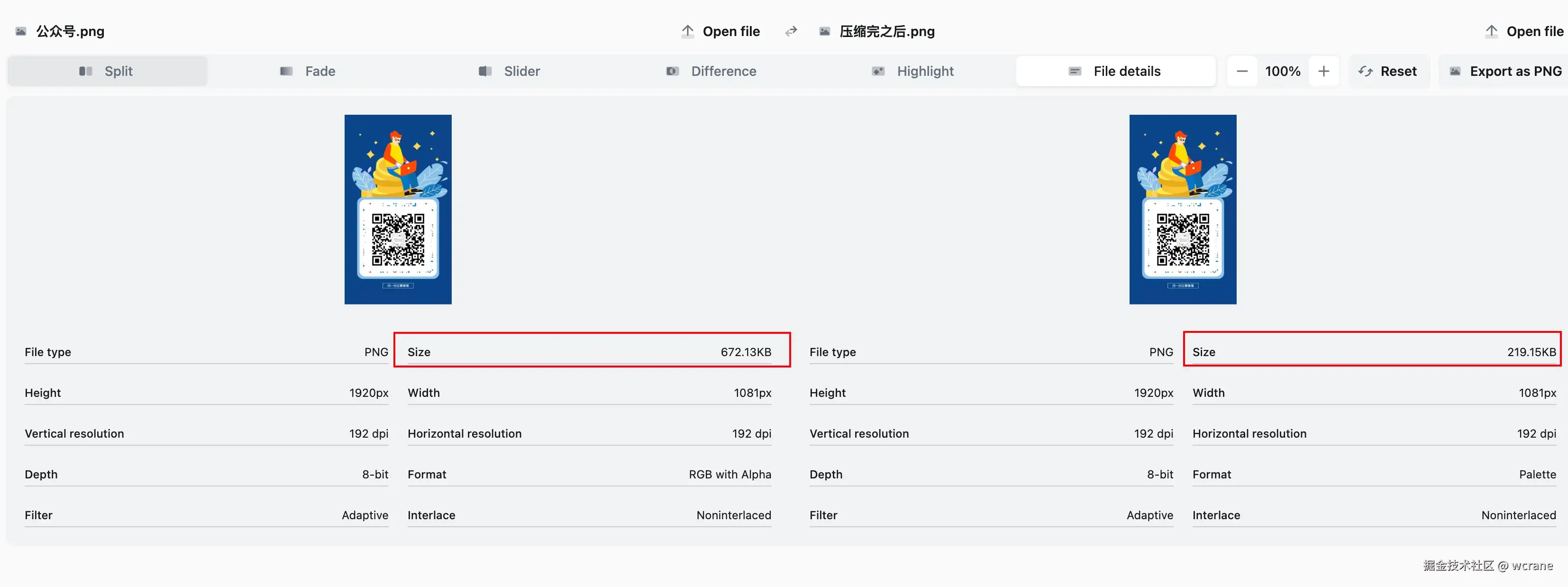 为了确保压缩效果的质量,我们进行了大量的测试,使用对比工具(diffchecker)评估不同压缩工具和设置下的效果。经过测试,imagequant 提供了与 TinyPNG 类似的压缩效果,图片大小缩减至原图的 27.6%(减少 62.4%)。