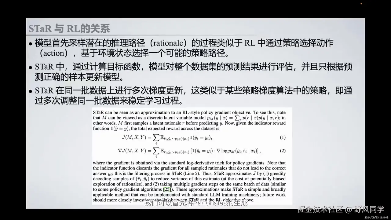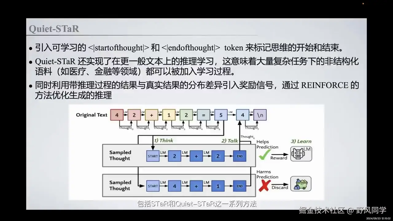 其实现在有很多探究和优化合成数据的思路。例如,我们可以将过程建模为Grow阶段和Improve阶段,这是Google Deepmind之前的一项工作。在Grow阶段,我们让模型生成多个输出预测。在Improve阶段,我们利用Reward Model对生成的输出数据进行过滤,选出高质量的数据进行微调。在实际微调过程中,我们会混入原始数据,这与RLHF、PTX的损失函数类似,目的是防止模型跑偏或崩溃。
