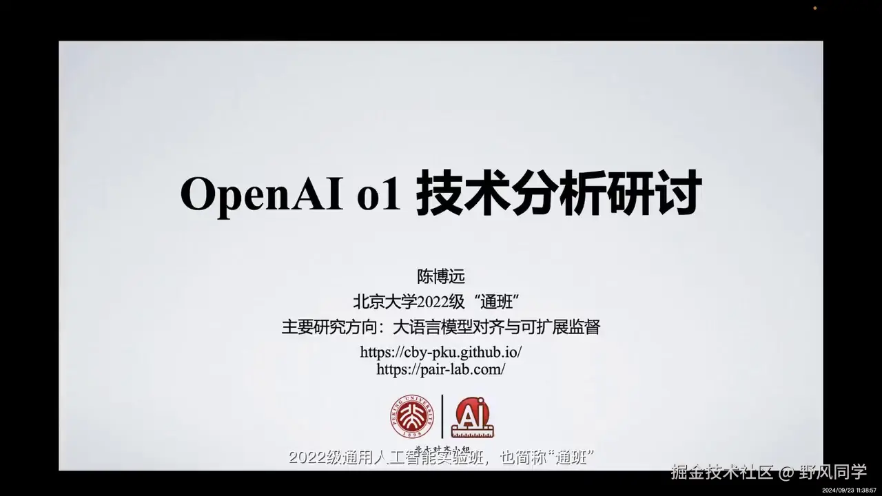 大家好,我是北京大学2022级通用人工智能实验班(简称通班)的陈博远,我的主要研究方向是大语言模型对齐与可扩展监督。我也是北大对齐小组的成员之一。今天非常荣幸能与大家一起进行OpenAI技术分析研讨。