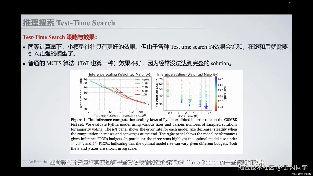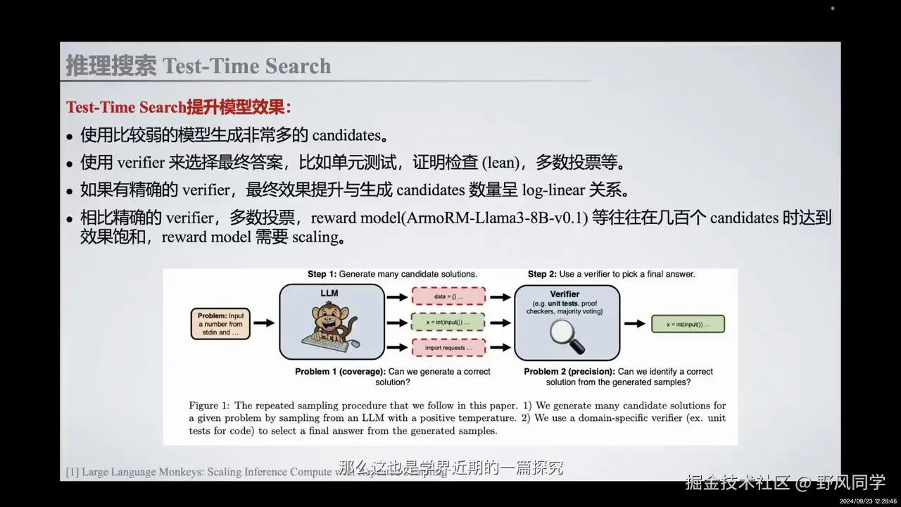 Test-Time Search提升模型的效果,例如这篇关于Large Language Models的研究。这也是近期学术界探讨如何通过Inference来提升模型系统的一篇论文。其实,这与我们之前提到的方法较为相似,即首先生成一些候选的solutions,然后使用一个外挂的Verifier来验证哪些solutions是可行且有希望的,最终选择出这些solutions用于最终的决策。