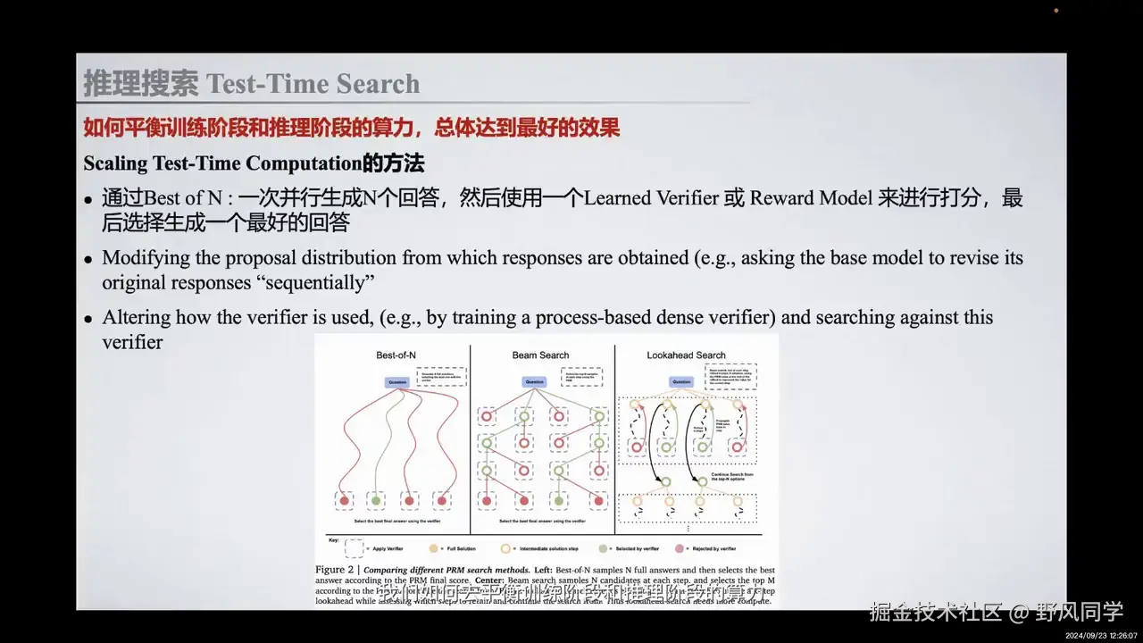 在核能数据之外,大模型的天花板启发我们思考如何在post-training skin loss的加持下,平衡训练阶段和推理阶段的算力,以达到最佳效果。在推理搜索部分,我们进行了一些优化。常见的推理搜索方法包括Best-of-N和Beam Search。我们发现,提升test-time computation的方法有很多,例如: