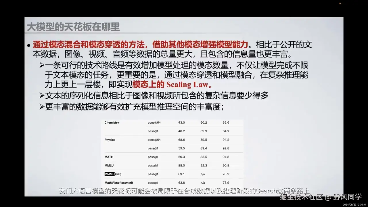 在当前训练数据匮乏的情况下,我们大语言模型的天花板可能会被局限于合成数据和推理阶段的搜索这两条路径上。另一个值得思考的问题是,大语言模型的天花板是否还受限于我们能否实现更强大的模态混合的Scaling Law。