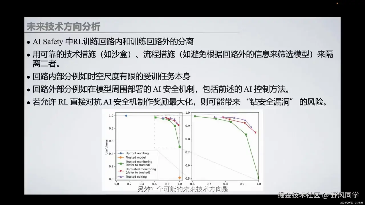 因此,我们需要在强化学习训练中进行回路内和回路外的分离。例如,使用沙盒等可靠的技术措施,或通过流程措施进行安全隔离。在回路内部分,我们进行受控训练;在回路外部分,部署安全机制,包括之前提到的AI控制方法,以防止模型因强化学习的奖励最大化而利用安全漏洞。