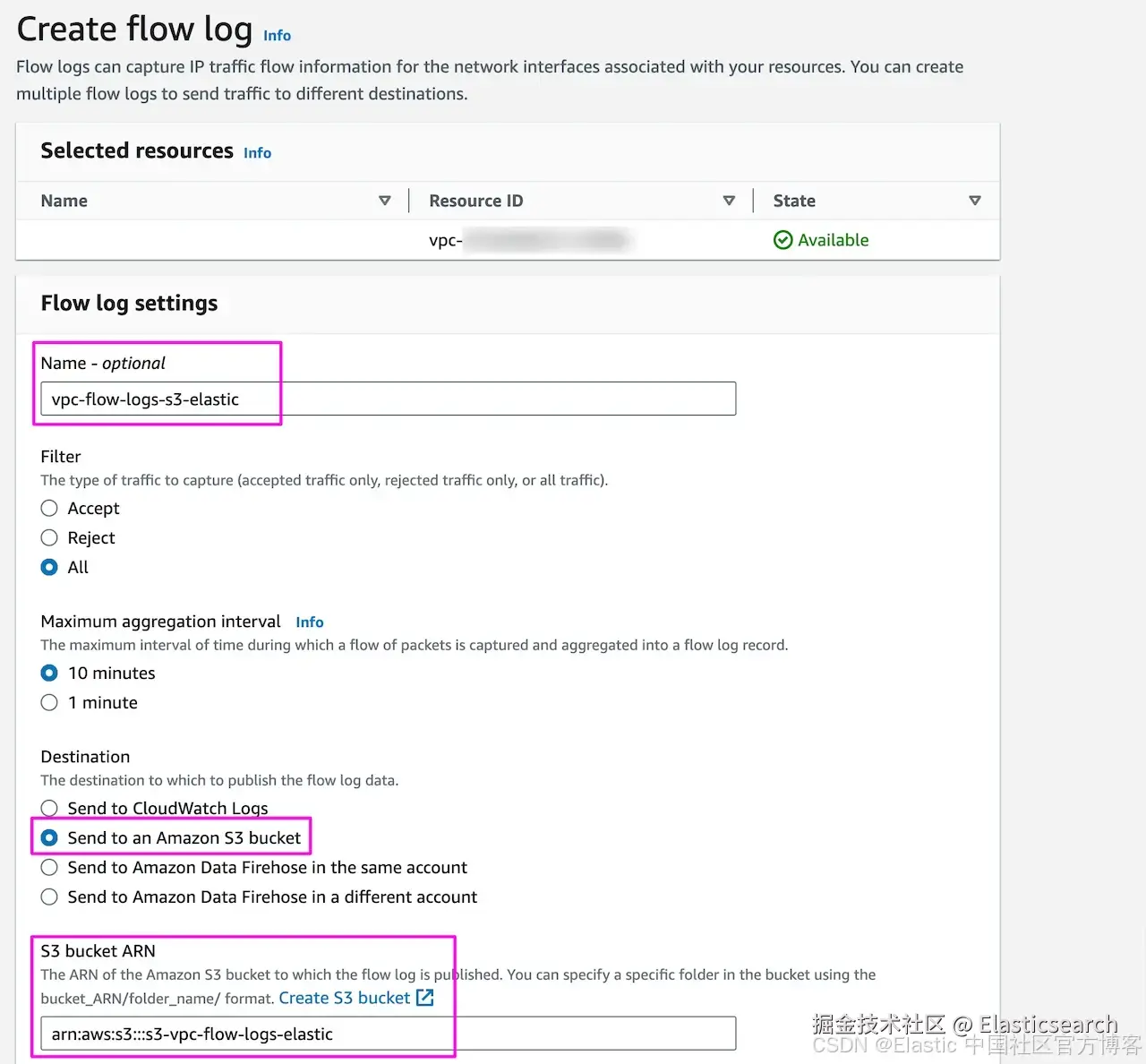 2)启用 VPC Flow 日志并发送到 S3 bucket s3-vpc-flow-logs-elastic