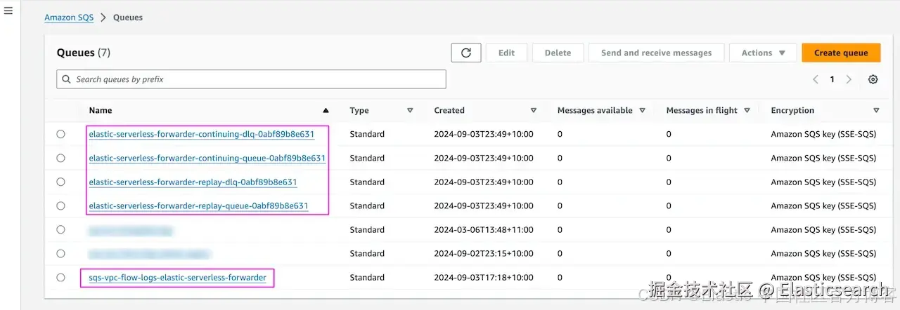 以下是成功部署 ESF 后自动创建的 SQS 队列: