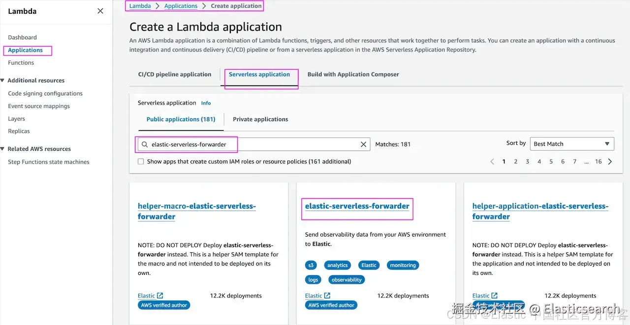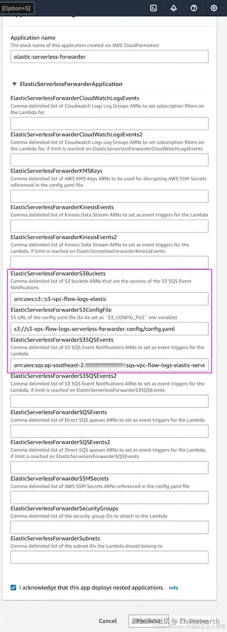 AWS Console -> Lambda -> Application -> Create Application,搜索 elastic-serverless-forwarder:
