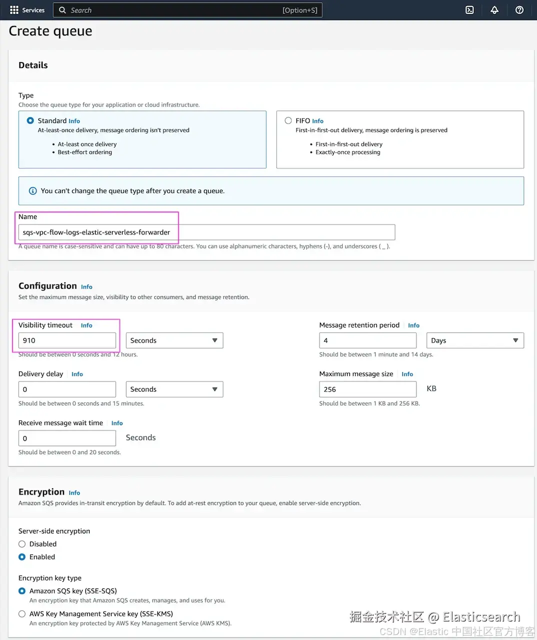 提供队列名称并将可见性超时更新为 910 秒。Lambda 函数最多运行 900 秒(15 分钟),为可见性超时设置更高的值允许消费者 Elastic Serverless Forwarder(ESF)处理并从队列中删除消息:
