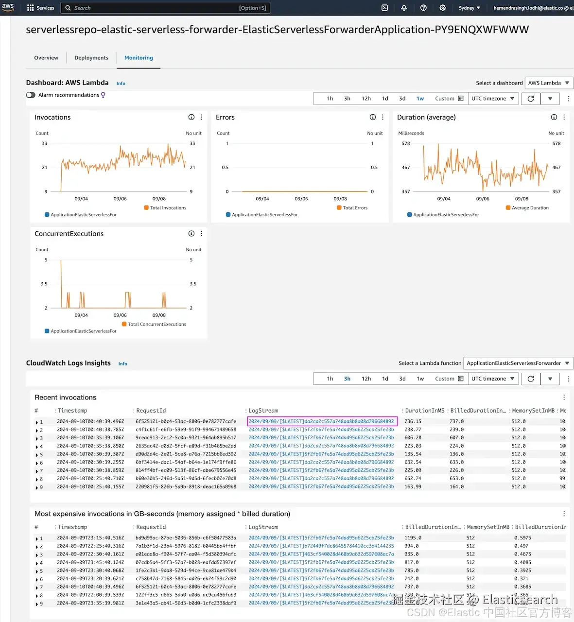 如果出现诸如 SQS 消息数持续增加等问题,请检查 Lambda 执行日志 Lambda -> Application -> serverlessrepo-elastic-serverless-forwarder-ElasticServerlessForwarderApplication* -> Monitoring -> Cloudwatch Log Insights。单击 LogStream 获取详细信息: