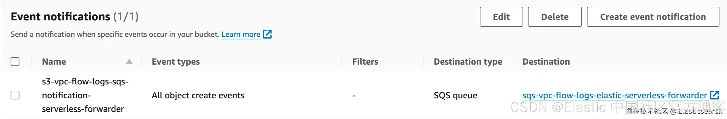 选择 destination 为 SQS queue 并选择 sqs-vpc-flow-logs-elastic-serverless-forwarder: