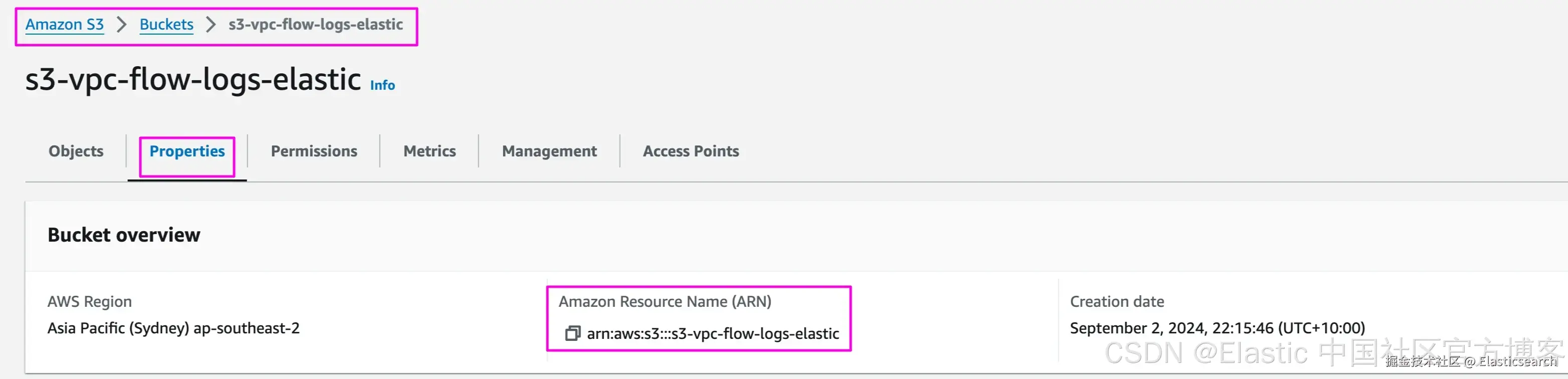 复制存储桶 ARN,下一步配置流日志时需要此 ARN: