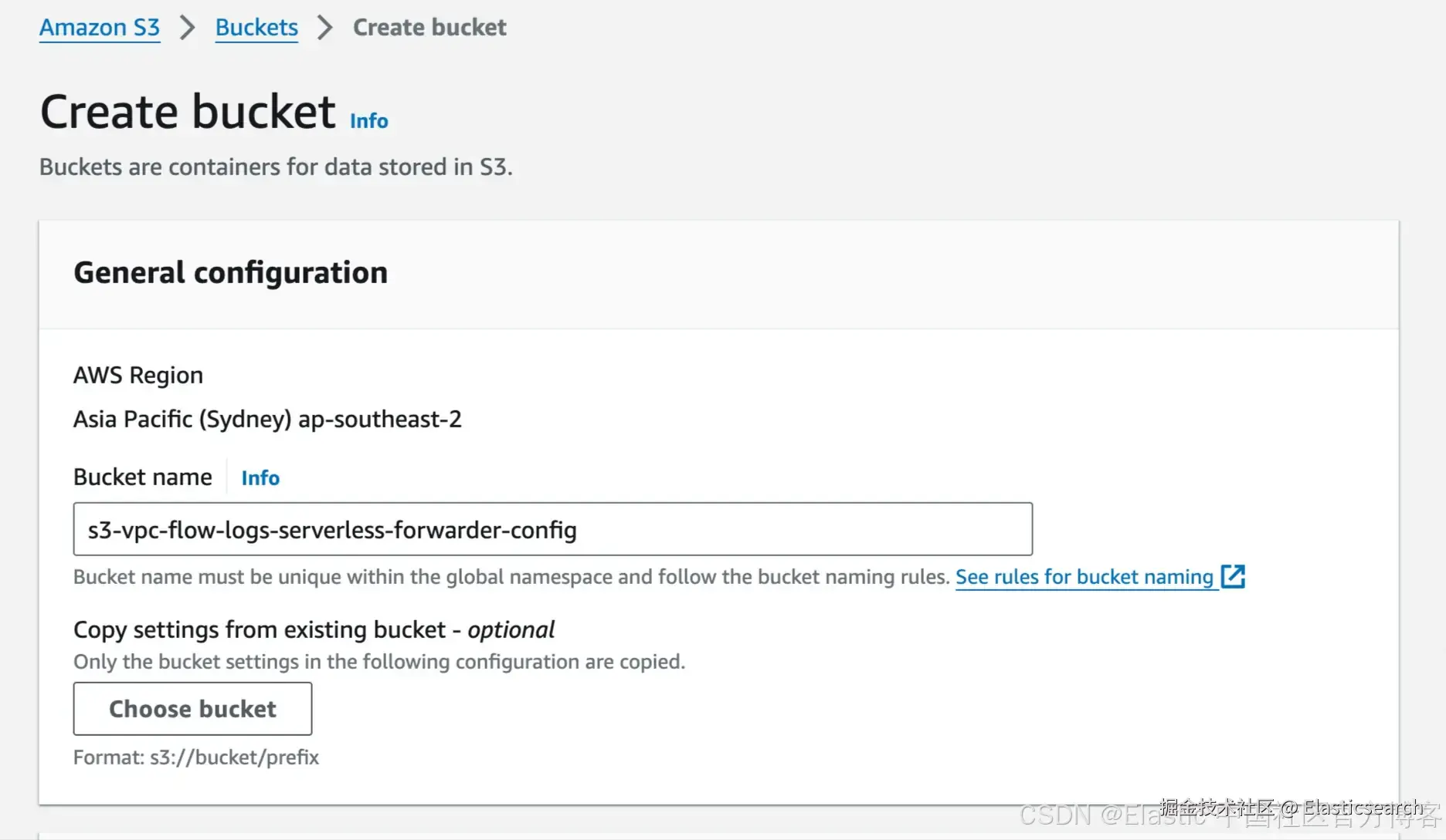 创建另一个 S3 存储桶来存储 Elastic Serverless Forwarder 的配置文件: