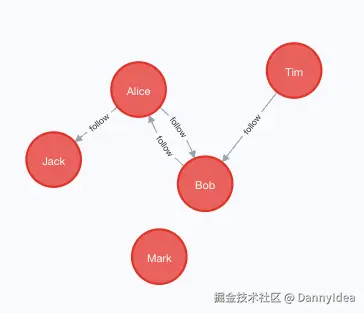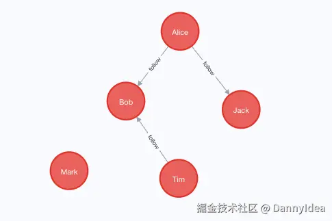 如果这里你希望做更复杂一些的产讯,例如查询某个用户关注者所关注的其他用户,例如下图关系链中,Bob和Alice互相关注,此时Tim作为Bob的粉丝,希望能知道Bob还关注了谁。