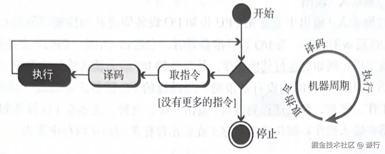 CPU 重复进行取指、解码、执行、存储结果和更新程序计数器的过程,直到程序结束或被外部中断