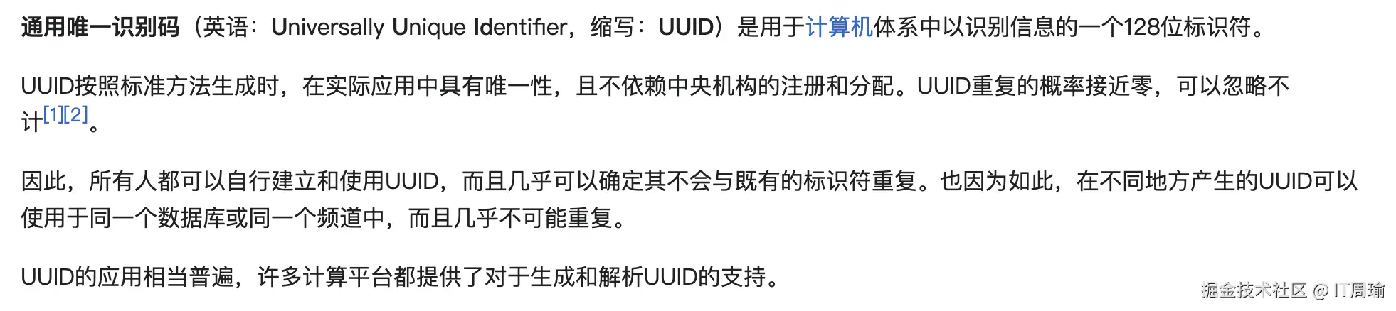不过由于UUID会占用更多的空间和本身的无序性,会影响数据库的插入、查询等操作的效率,需要慎重考虑是否使用。
