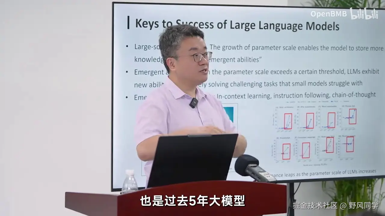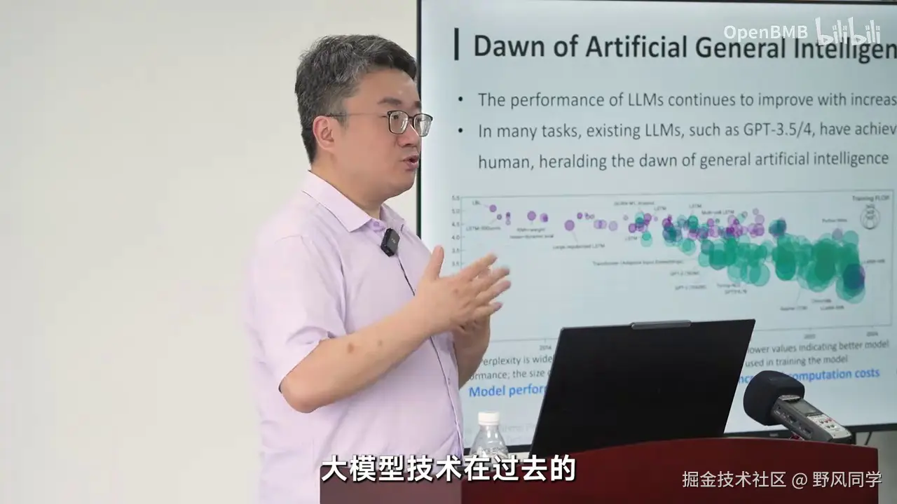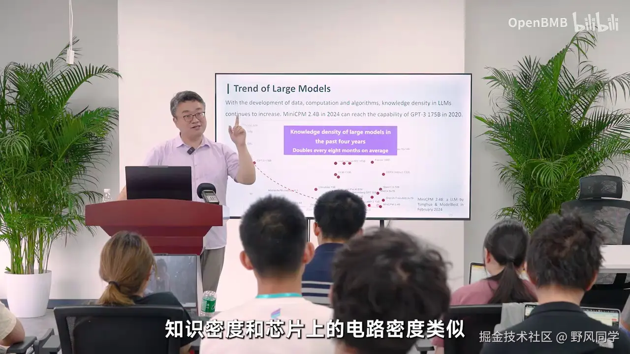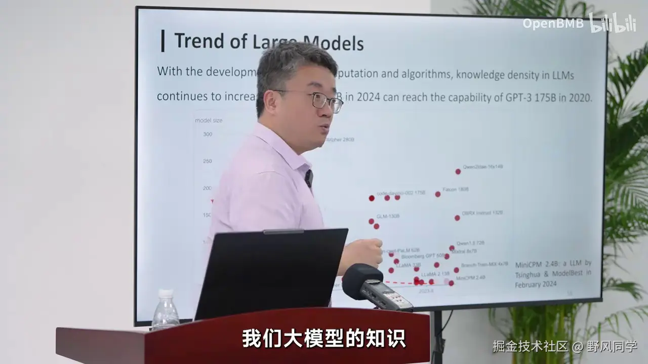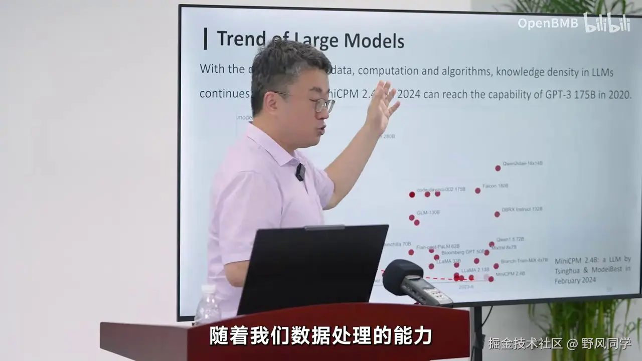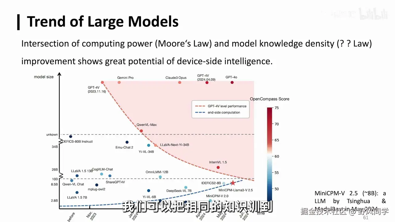 这只需要250亿参数即可实现,并且这一趋势将持续增长。我们认为知识密度与芯片上的电路密度类似,这标志着大模型制程的进化。五年前,OpenAI展示了规模法则的实用性,但我们并非追求模型越大越好。未来的竞争在于模型的制程,我们需要持续增强其知识密度。只有这样,才有可能构建一个更具竞争力的模型,使其以更少的参数和能耗实现更强的智能能力。这无疑是未来大模型发展的重要方向。为何如此?一方面,从GPT-3到MiniCPM 2.4B的文本模型,以及在多模态模型上的类似现象,如2023年11月的GPT-4V,这是一个典型的多模态模型,当时为CPU2。到2024年5月,我们发布的MiniCPM-V2.5版本,仅需约8B参数即可达到相似能力。即使在多模态模型中,过去半年多的时间里,知识密度也在急剧增强。未来人工智能的发展趋势是通过更强、更好、更可预测的技术,不断提升模型制程,持续增强知识密度。这才是大模型未来的竞争焦点。我们并非简单地追求更多算力、更多数据、更大的模型,而是通过技术提升,实现更高效、更有技术含量的发展。OpenAI已经验证了这一点,重复相同制程去训练一个原本可以训练百亿模型的过程,现在去训练一个千亿模型,已不再是技术进步的标志。