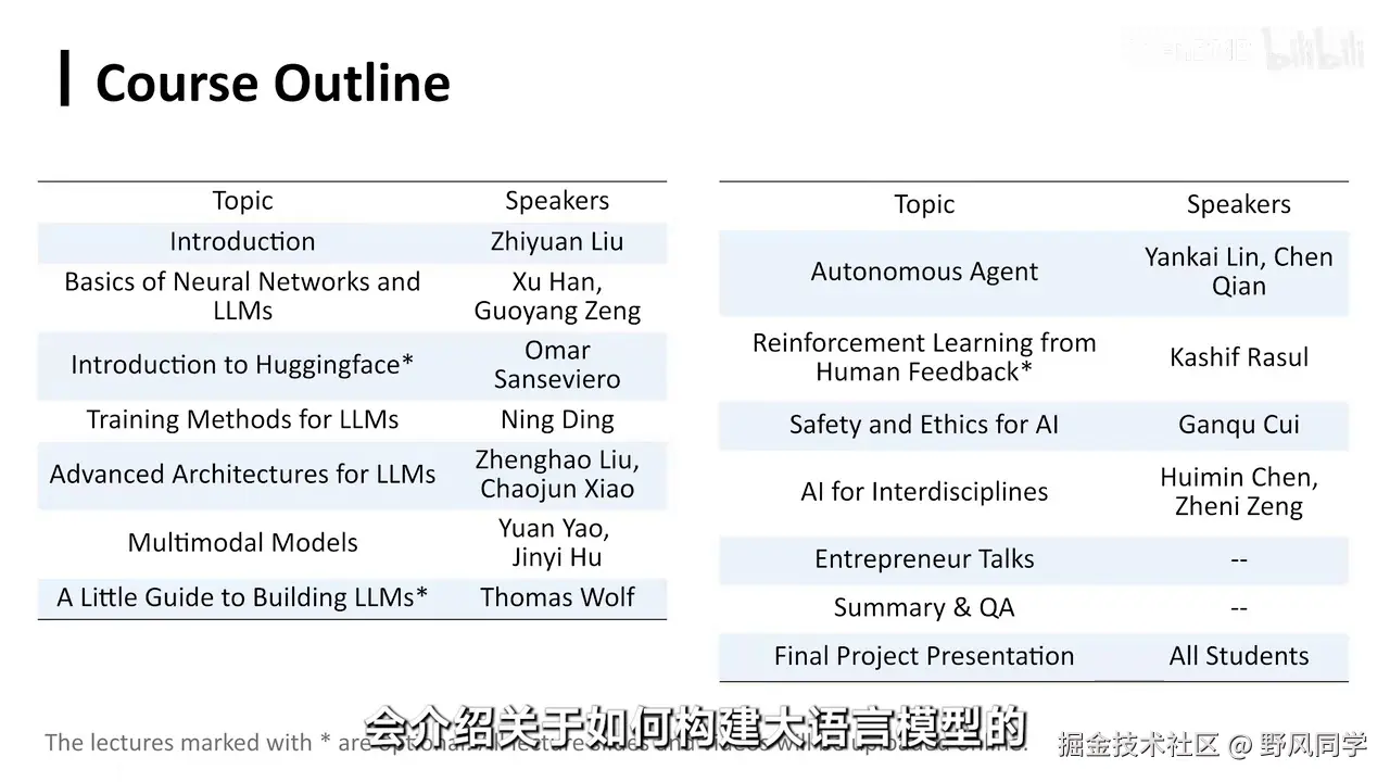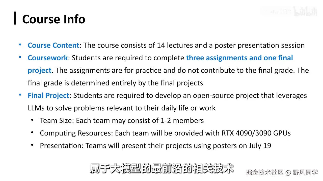 - 课程项目:学生需完成一个利用大语言模型解决问题的开源项目,并进行海报展示。