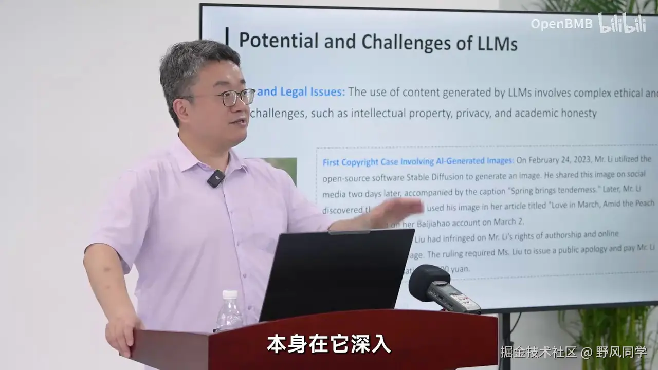 基本上可以被认为是对人类机械性脑力劳动的一种替代。因此,在未来,某些行业中,对大家的就业和工作分工将产生重大影响。这也是我们需要考虑的问题。当然,还存在一些法律和伦理上的问题,例如,如果一个人基于大型模型工具创作了作品,那么这个作品的版权应归属于作者还是其他方?或者因为作品是由AI产生的,是否意味着它没有版权?这是一个值得探讨的问题。在中国国内,通常认为如果一个人利用AI工具创作了作品,那么该作品的版权应归属于作者,因为使用AI工具的过程本身也体现了作者的能力和提供的提示词(Prompt)的价值。