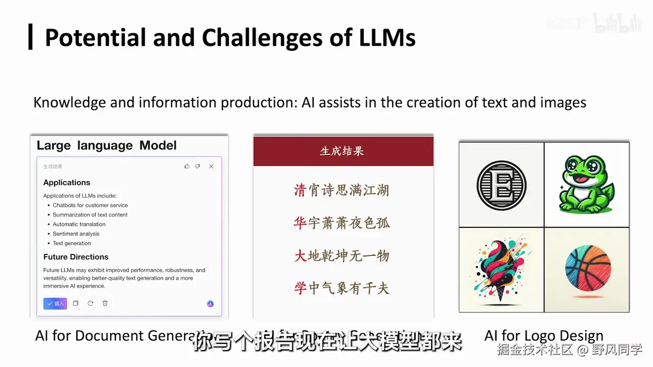 我们会说大模型的应用其实非常广泛,例如,我们可以利用它来生成所需的文档,无论是撰写PPT还是报告,大模型都能提供草稿。此外,它还能进行诗歌创作、图像生成或设计,以及辅助科学发现,如蛋白质结构预测、降雨预测和古代文字识别等。这些应用都显示了大模型在各个领域的重要角色。