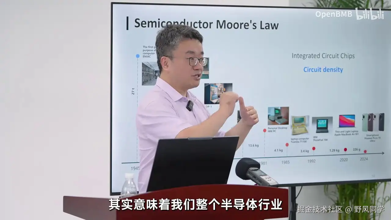 过去五年,我们已经见证了大模型的蓬勃发展。OpenAI提出的规模法则不断得到验证,模型的参数规模和能力都在不断增强。然而,未来的发展是否仅仅是将模型做得更大?我们认为这并非本质。一个重要的参考坐标是半导体行业的摩尔定律。在摩尔定律的支持下,集成电路经历了近80年的蓬勃发展,使得我们能够在更小的芯片上实现更强大的计算能力。摩尔定律最初由摩尔在1965年提出,他认为芯片的电路密度每两年会增加一倍,从而使计算能力翻倍。这一规律至今仍在影响着技术的发展。