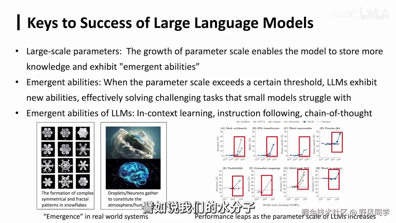 - 涌现能力:指模型在达到一定规模后,突然展现出之前不具备的新能力。