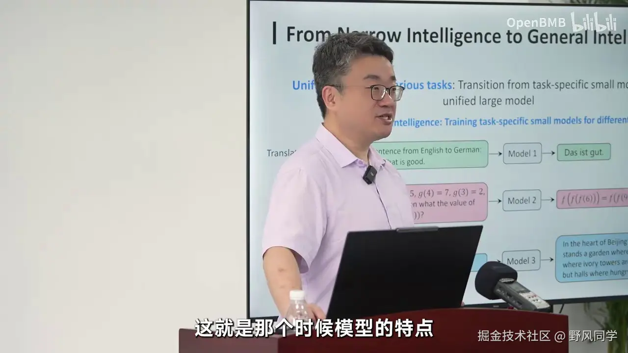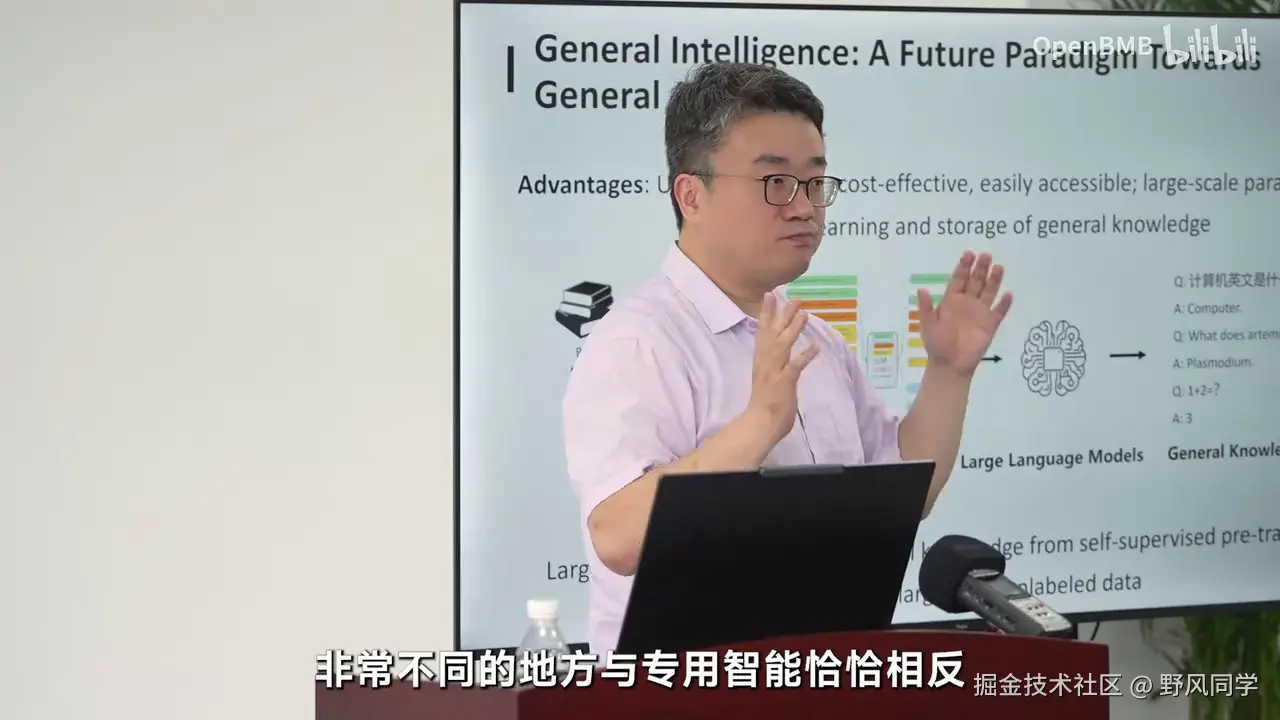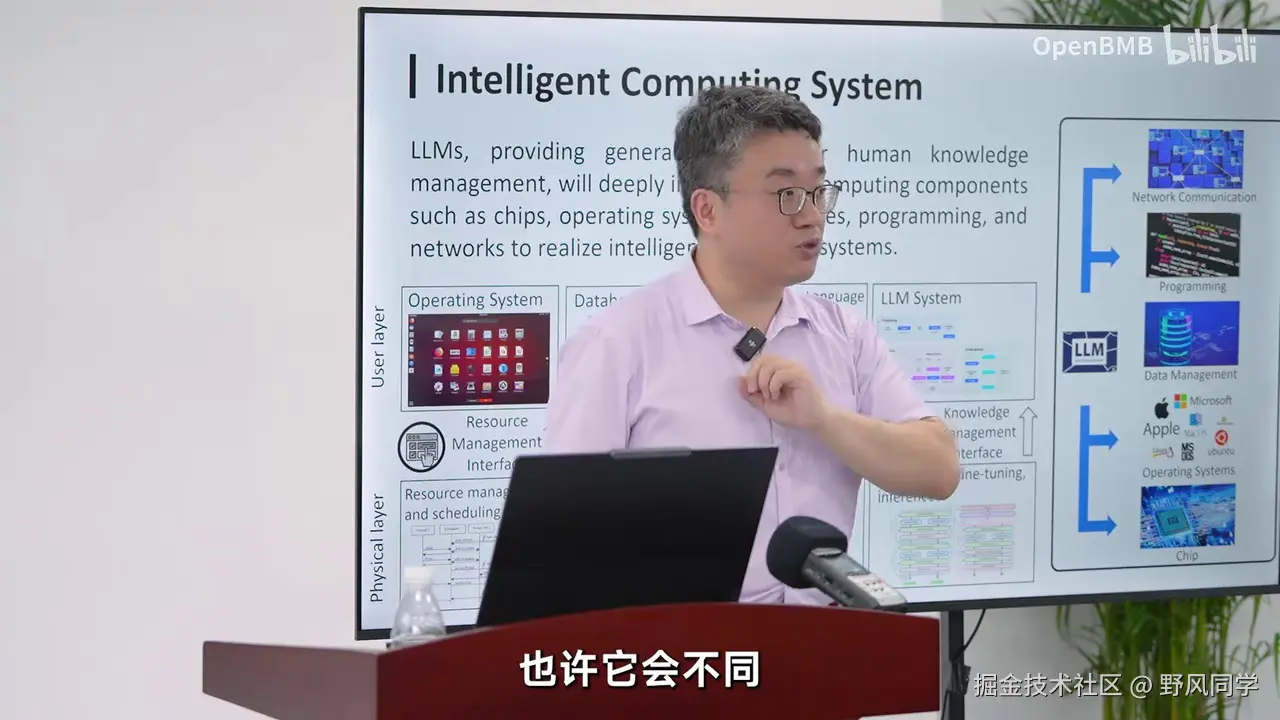 更可预测的,高质量地训练模型。第二个非常重要的问题是,大语言模型本身,我们反复强调,它是一种从数据到知识的通用提取过程。它代表了我们人类管理知识的能力,是一种非常通用的接口,帮助我们更好地管理各个领域的知识。正如整个计算系统,其核心在于通用性。我们会看到,操作系统提供了通用的接口,使不同设备能够统一运行。数据库提供了统一的SQL接口,对不同行业、领域的数据进行统一治理。编程语言针对不同任务和需求,提供了一套统一的语言来完成任务。大语言模型是对知识的统一管理。因此,未来一个重要的使命是将大语言模型深入到整个计算系统的各个方面,深入融合,使其成为通用的智能计算系统,服务于各行各业。我们不可能为每个领域单独开发一个大模型系统,这不是未来AGI发展的模式。未来AGI的发展模式应如历史上的操作系统、数据库和编程语言一样。