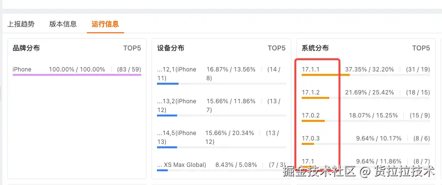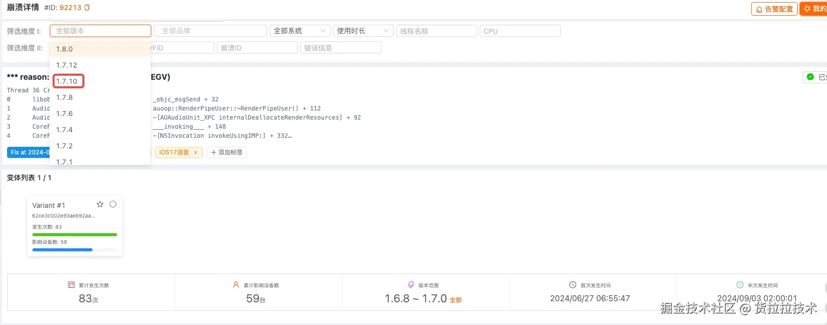 上线之后,我们可以看到,最新的版本是1.7.10版本,而这个崩溃最后出现的版本是1.7.0,也就表明上线之后,新版本就没再出现过。