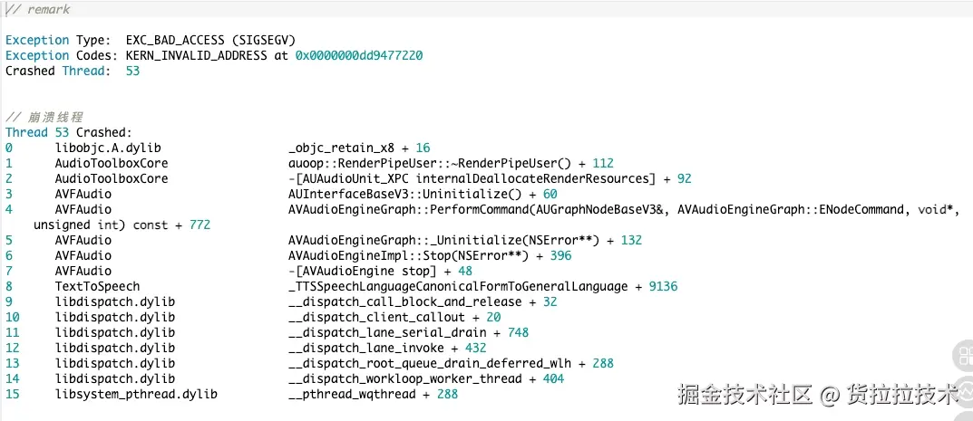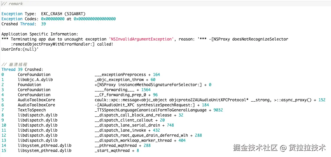 我们司机端从iOS17开始存在着一个文本转语音功能的崩溃,主要集中在司机导航、司机履约语音提醒等方面,因为这些方面都用到了文本转语音进行播报的功能,从崩溃收集版本信息来看,该崩溃集中在iOS17.0 - iOS17.2之间相关版本,