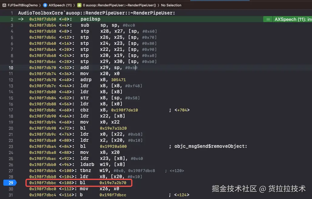 由于这里不是最顶层的崩溃堆栈,所以偏移指令112-4=108,我们看108指令指向的是0x198f7dbbc <+108>: bl 0x19e7a2b70方法。