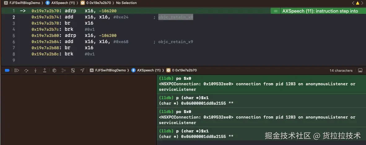 po $x0来显示对象信息,p (char*)$x1来显示方法名称