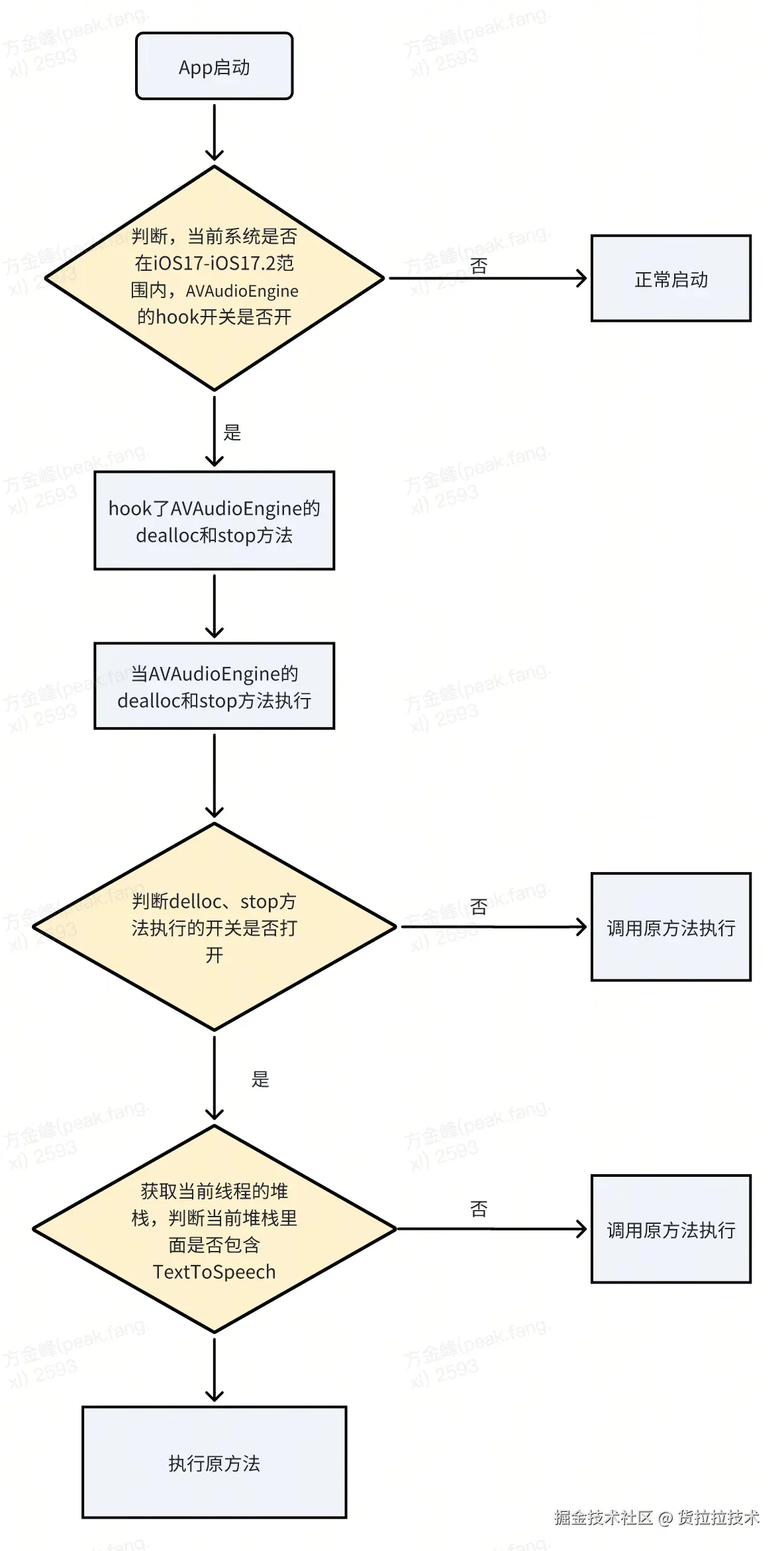 所以我们尝试hook这两个-[AVAudioEngine stop]和-[AVAudioEngine dealloc]方法,判断如果当前堆栈里面包含TextToSpeech表明这是一个文本转语音相关调用,则不去执行原方法。