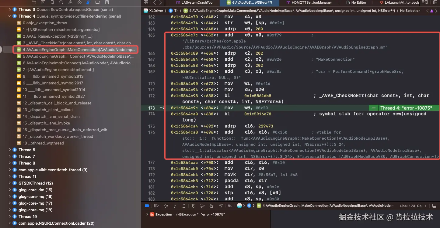 这时候具体分析抛出异常的堆栈,我们可以看到AVAudioEngineGraph.mm是OC和C++混编,也就是说这里对于_xpcConnection变量,使用的引用计数管理是MRC。